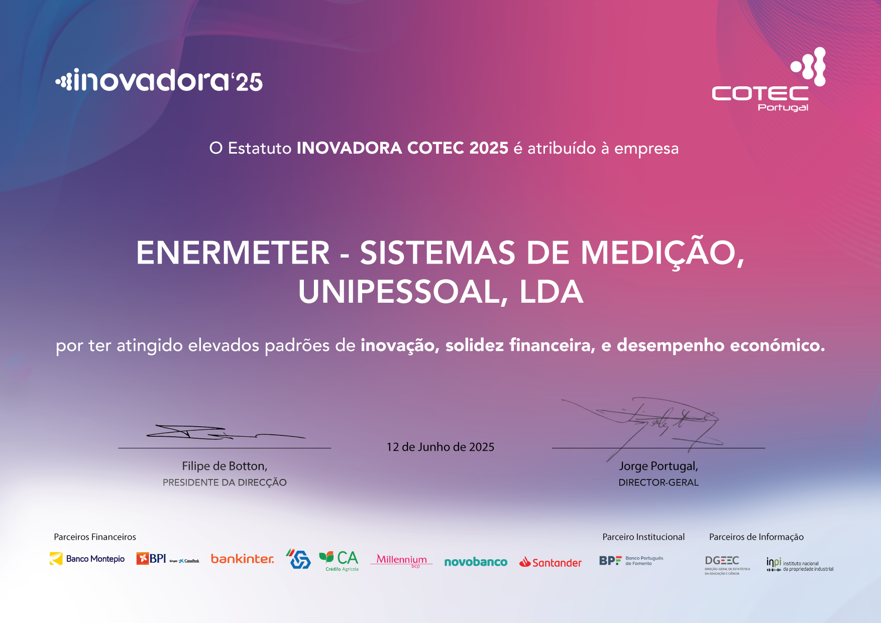 Temos o orgulho de anunciar que a Enermeter foi distinguida com o Estatuto Inovadora COTEC 2025, uma iniciativa promovida pela COTEC Portugal, em parceria com os principais bancos e entidades institucionais do país.